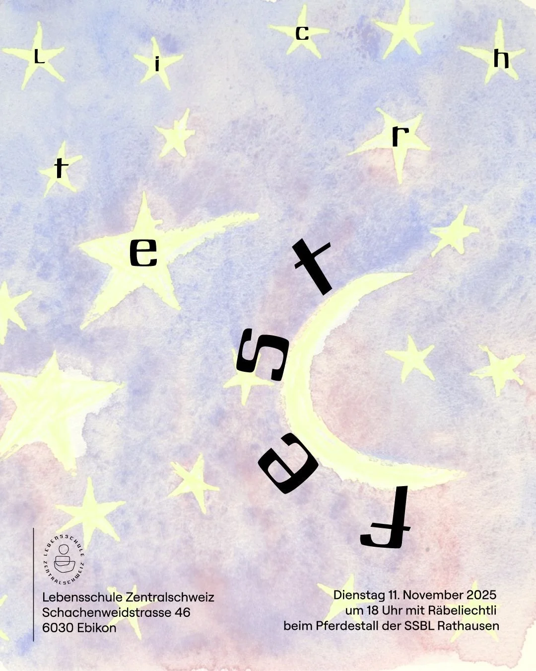 Wir treffen uns alle von der Spielgruppe bis zur 2. Klasse um 18 Uhr beim Pferdestall der SSBL Rathausen. Mit unseren Liechtli spazieren wir mit Gesang bis zum Seehof. Dort lauschen wir einer Geschichte, wärmen uns bei einem Tee auf, teilen ein Brötchen und spazieren anschliessend wieder zurück. Wir bitten während dieses Anlasses die persönlichen Gespräche zu unterlassen. DANKE von Herzen für das Verständnis.